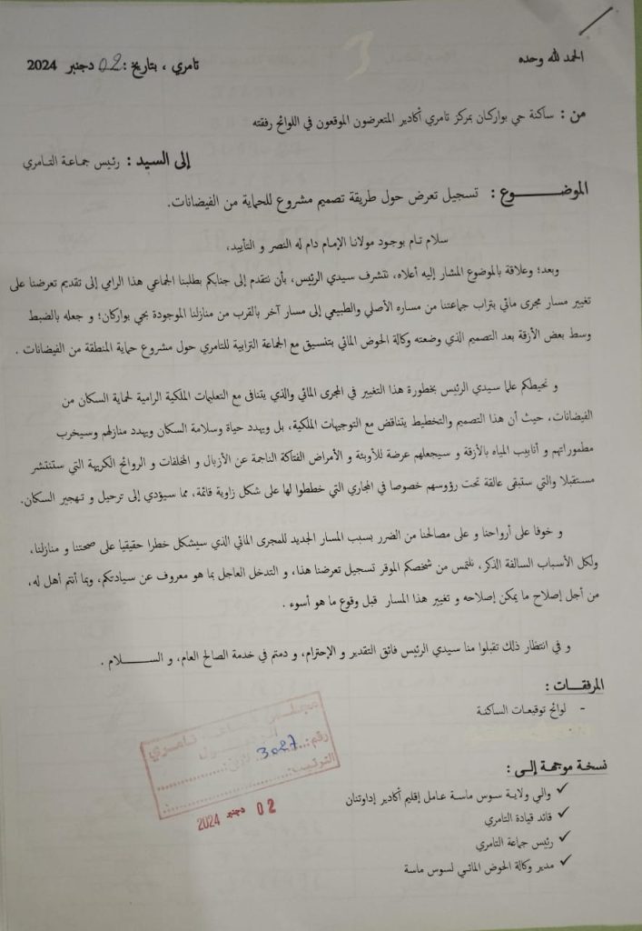 ورفع المحتجون المحتجة شعارات تطالب برفع الضرر الذي سيهدد مساكنهم، مستنكرين تغيير المسارات الأصلية للشعاب والأودية المائية. وتساءل الغاضبون عن أسباب تغيير الدراسة الأصلية للمشروع، المنشورة سنة 2022، وحيثيات تغيير بعض قنوات توجيه الشعاب المائية، وتعمد تمريرها بين منازل الساكنة.