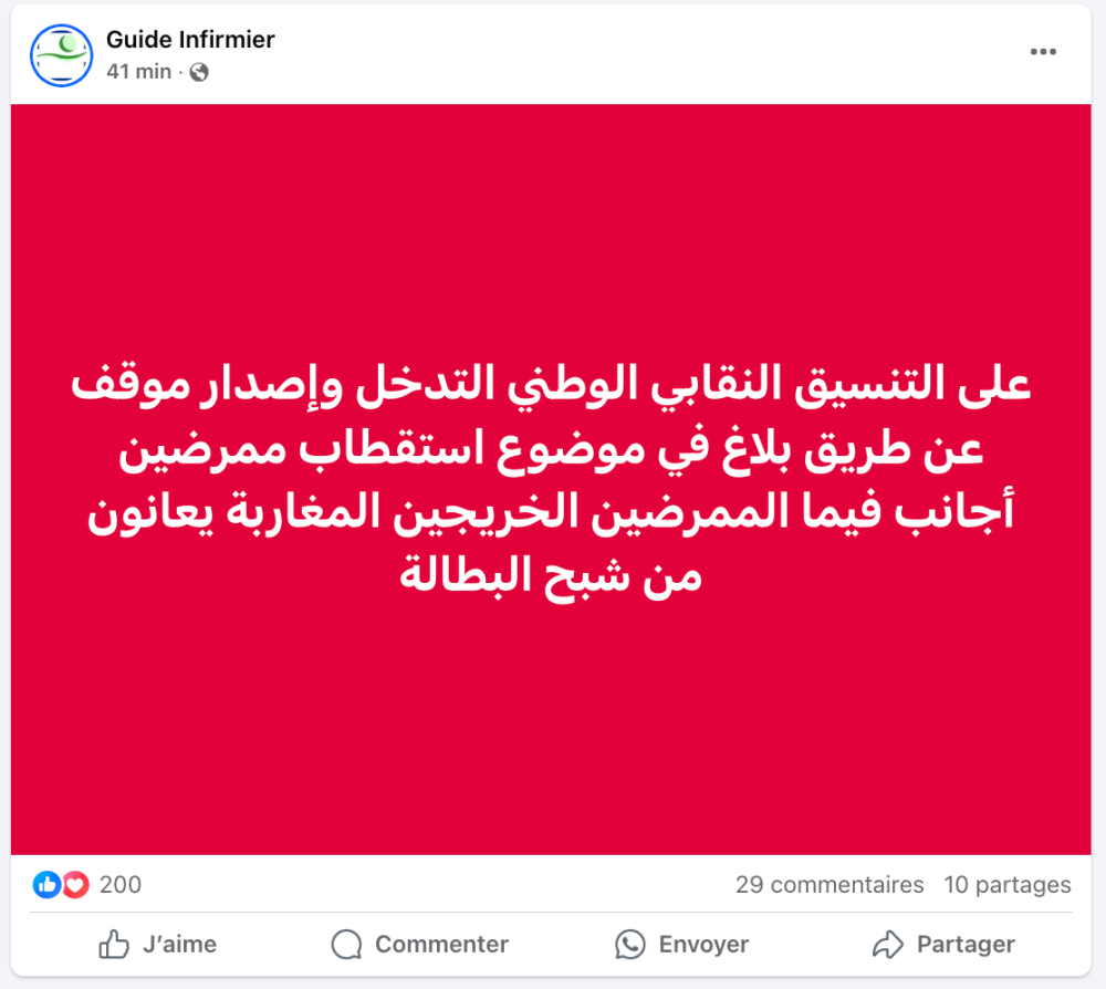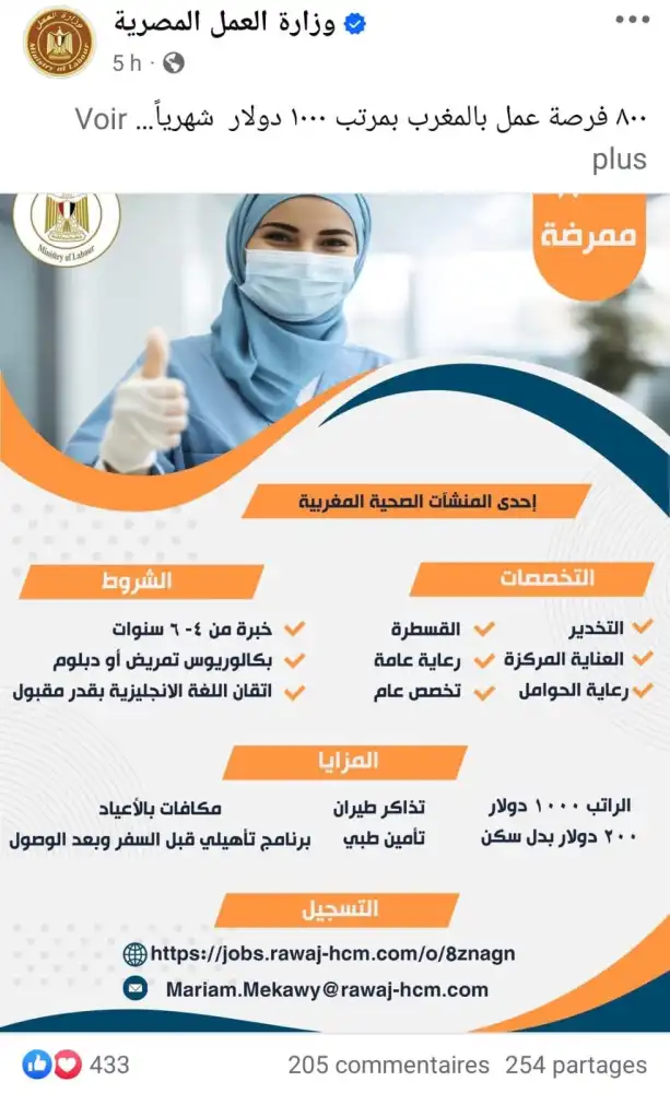 نشرت الصفحة الرسمية لوازرة العمل المصرية بموقع التواصل الاجتماعي فايسبوك، إعلانا للوزير الوصي على القطاع يعلن عن توفير 800 فرصة عمل في القطاع الصحي من الجنسين للعمل في المغرب مقدمة من إحدى المنشآت الصحية المغربية، وذلك بمرتب يقارب 10 الاف درهم شهريا، إضافة إلى دعم مالي للسكن مُقدر بحوالي 2000 درهم.