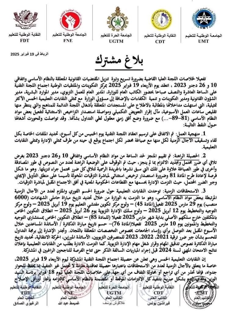 وللخروج من حالة الجمود، تم الاتفاق على عقد اجتماعات تقنية أسبوعية كل يوم خميس لإيجاد حلول للملفات العالقة، مع تحديد مواعيد استحقاقات هامة، منها مباريات الترقية المقررة في 29 مارس و10 أبريل 2025، وانطلاق دورات تكوين أطر الإدارة التربوية في 26 أبريل.