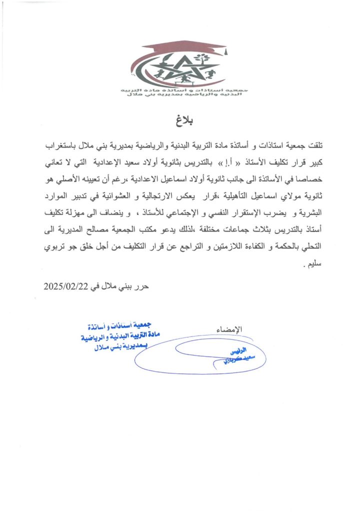 عبّرت جمعية أستاذات وأساتذة مادة التربية البدنية والرياضية بمديرية بني ملال عن استغرابها الشديد إزاء قرار تكليف الأستاذ بالتدريس بثانوية أولاد سعيد الإعدادية، رغم أن هذه المؤسسة لا تعاني من أي خصاص في أساتذة المادة، إلى جانب ثانوية أولاد إسماعيل الإعدادية، في حين أن تعيينه الأصلي يخص ثانوية مولاي إسماعيل التأهيلية.
