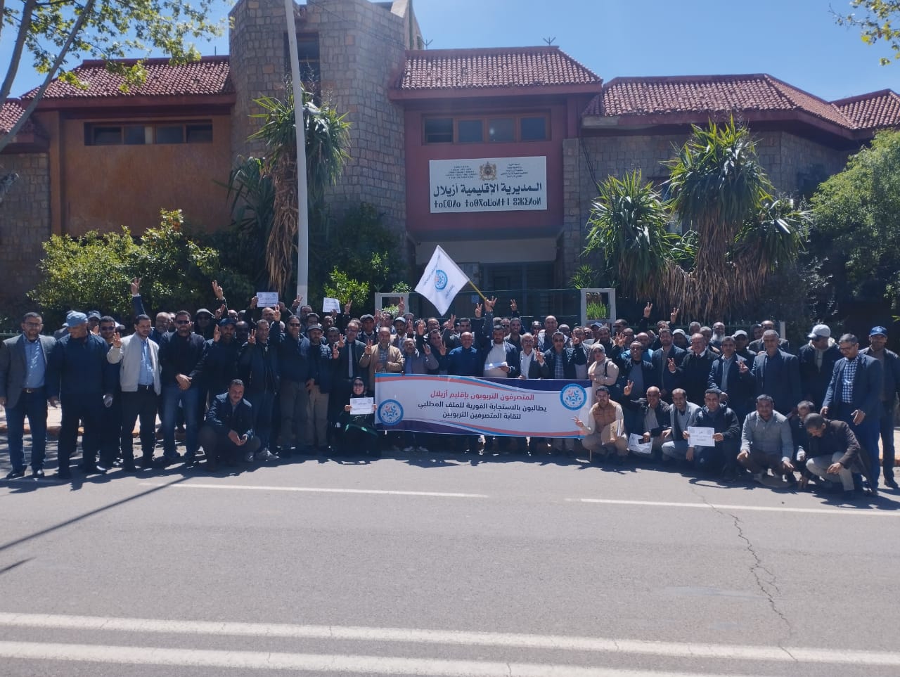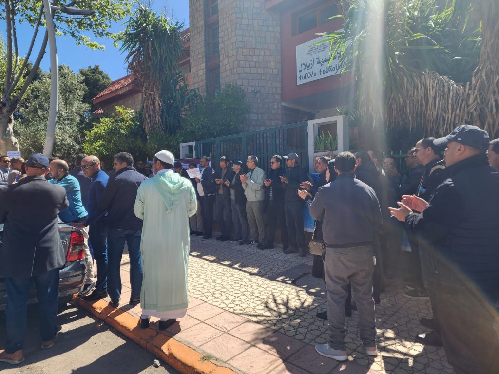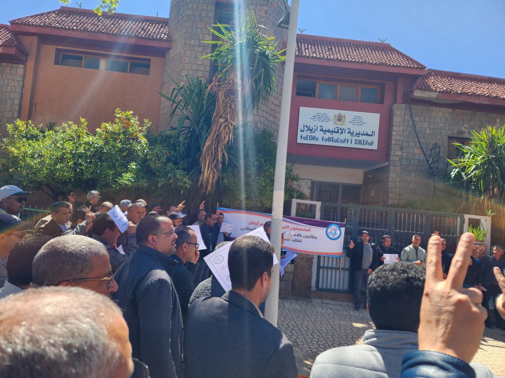 نظم عدد من المتصرفين التربويين، يوم الخميس 17 أبريل 2025، وقفة احتجاجية أمام مقر المديرية الإقليمية لوزارة التربية الوطنية والتعليم الأولي والرياضة بأزيلال، استجابةً لدعوة المكتب الإقليمي لنقابة المتصرفين التربويين، وفي إطار البرنامج النضالي التصعيدي الذي أقره المكتب الوطني للنقابة.