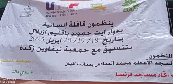 في مبادرة إنسانية متميزة، وبشراكة مع المديرية الإقليمية لوزارة التربية الوطنية والتعليم الأولي والرياضة بأزيلال، وبتنسيق مع السلطات المحلية بقيادة آيت تمليل، نظمت جمعية السلسبيل، والمسجد الأعظم محمد السادس بسانت إتيان، واتحاد مساجد فرنسا، ونادي باك، قافلة إنسانية لفائدة تلاميذ الوحدة المدرسية آيت حمودو التابعة لمجموعة مدارس تسكنت، وذلك يومي 19 و20 أبريل 2025.
