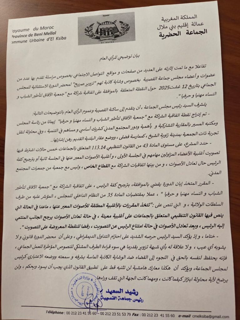 تفاعلاً مع ما تم تداوله على صفحات ومواقع التواصل الاجتماعي بشأن اتهامات تتعلق بـ”تزوير صريح” لمحضر الدورة الاستثنائية لمجلس جماعة القصيبة بتاريخ 12 غشت 2025، والمتعلقة بالمصادقة على اتفاقية شراكة مع جمعية الآفاق لتأطير الشباب والنساء مهنياً وحرفياً، خرج رئيس المجلس ببيان توضيحي للرأي العام.