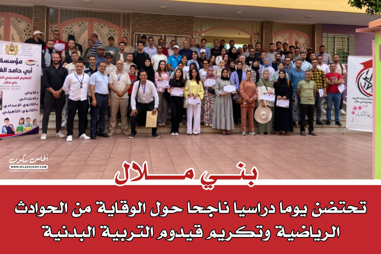 احتضن فضاء مؤسسة أبي حامد الغزالي ببني ملال صباح اليوم الأحد 28 شتنبر الجاري 2025، يوما دراسيا متميزا حول موضوع الوقاية من الحوادث الرياضية خلال الحصص الدراسية، وذلك بمبادرة من جمعية أستاذات وأساتذة مادة التربية البدنية والرياضية بالمديرية الإقليمية للتعليم.