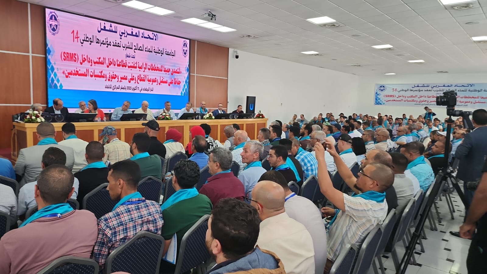 عقدت الجامعة الوطنية للماء الصالح للشرب المنضوية تحت لــواء الاتحاد المغربي للشغل مؤتمرها الوطني الرابع عشر يوم11 أكتوبر 2025 بالمقر المركزي للاتحاد المغربي للشغل بالدار البيضاء، تحت الاشرف الفعلي للأخ الأمين العام و بعض أعضاء الأمانة الوطنية للاتحاد المغربي للشغل، افتتح المؤتمر بكلمة توجيهية للأخ الأمين العام رحب من خلالها بضيوف المؤتمر و جميع المؤتمرات و المؤتمرين، كما تناول خلالها الأوضاع الوطنية و السياسات العمومية المتبعة من طرف الحكومة، و أكد على دعم الاتحاد المغربي للشغل للقضية الفلسطينية، و للحراك السلمي ل “جيل زيد” المطالب بالصحة و التعليم و الشغل و السكن. بعدها تفضلت رئاسة المؤتمر على تكريم عائلات مناضلي الجامعة المتوفين وكذلك المناضلين المحالين على التقاعد والآخرين الذين على أبواب التقاعد، ولقد أتم المؤتمر أشغاله، بالمصادقة على التقريرين الادبي و المالي، وكذلك على جميع المقررات، وفي الأخير انبثقت عنه اللجنة الادارية التي بدورها انتخبت المكتب الجامعي.