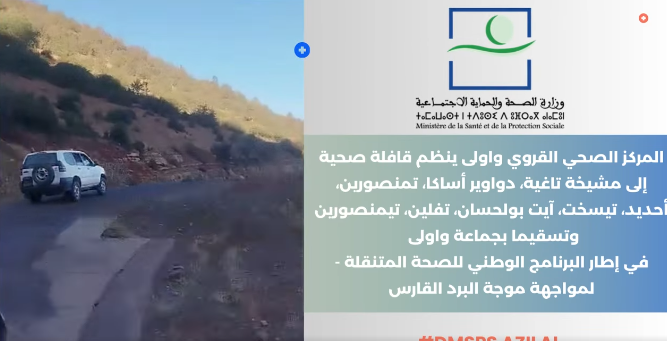 في إطار البرنامج الوطني للصحة المتنقلة الرامي إلى مواجهة موجة البرد القارس وتخفيف معاناة ساكنة المناطق الجبلية، نظّم المركز الصحي القروي واولى بإقليم أزيلال قافلةً صحيةً ميدانية إلى مشيخة تاغية، شملت دواوير: أساكا، تمنصورين، أحديد، تيسخت، آيت بولحسان، تفلين، تيمنصورين وتسقيما.