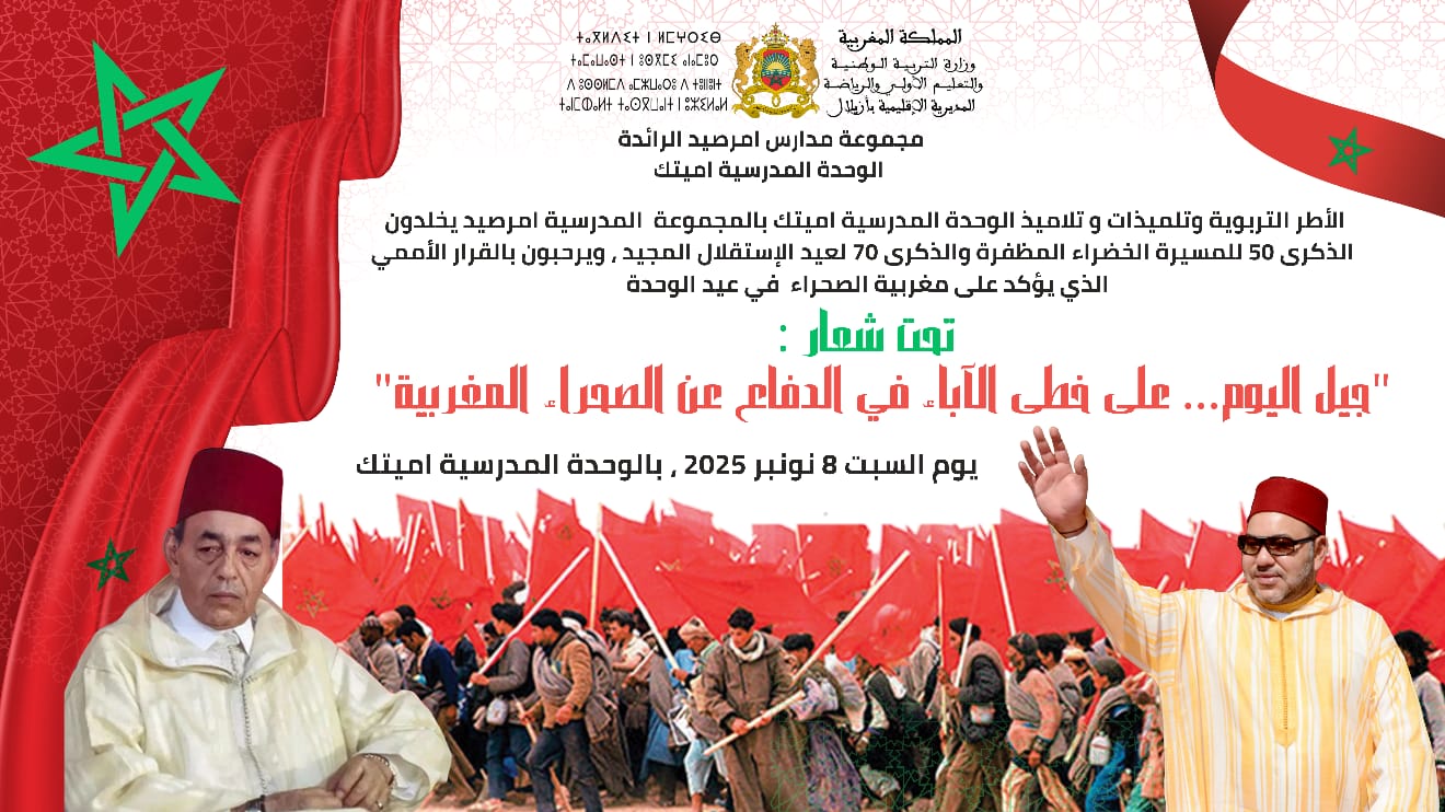 في إطار الاحتفاء بالذكرى الخمسين للمسيرة الخضراء المظفرة، والذكرى السبعين لعيد الاستقلال المجيد ، نظمت الوحدة المدرسية إميتك التابعة لمجموعة مدارس أمرصيد، حفلا تربويا وفنيا متميزا جسد قيم الوحدة الوطنية والتلاحم الثقافي، وأبرز روح الانتماء والاعتزاز بالوطن في نفوس الناشئة.