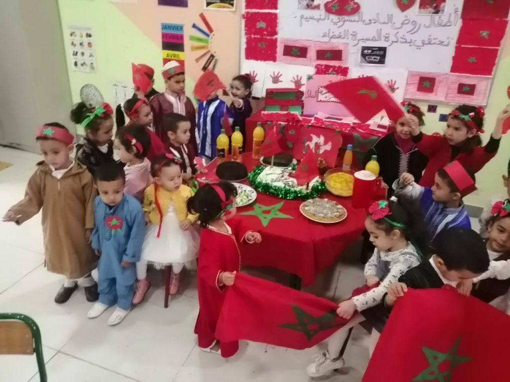 وقد انطلقت المسيرة الرمزية من ساحة المؤسسة، حيث حمل الأطفال الأعلام الوطنية ورددوا النشيد الوطني وأناشيد وطنية تعبّر عن حب الوطن والاعتزاز بالصحراء المغربية. كما ارتدى الصغار الزي الوطني التقليدي، وحملوا صور جلالة الملك محمد السادس وشعارات تمجد الوحدة الترابية للمملكة، وسط أجواء من الحماس والفرح والبراءة.