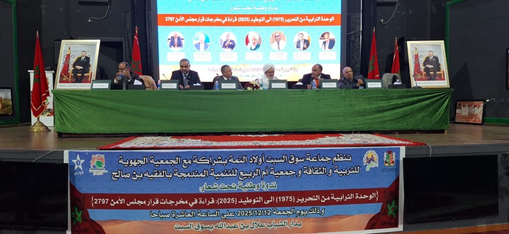هذه الندوة الوطنية نظّمها المجلس الجماعي لسوق السبت أولاد النمة بشراكة مع الجمعية الجهوية للتربية والثقافة وجمعية أم الربيع للتنمية المندمجة تحت عنوان: “الوحدة الترابية من التحرير (1975) إلى التوطيد (2025): قراءة في مخرجات قرار مجلس الأمن 2797″، وحضرها عامل إقليم الفقيه بن صالح، وعدد من المسؤولين المحليين والإقليميين والفاعلين السياسيين والجمعويين، إلى جانب نخبة من الأساتذة الجامعيين والطلبة والخبراء المتخصصين في القضايا القانونية والسياسية الدولية.