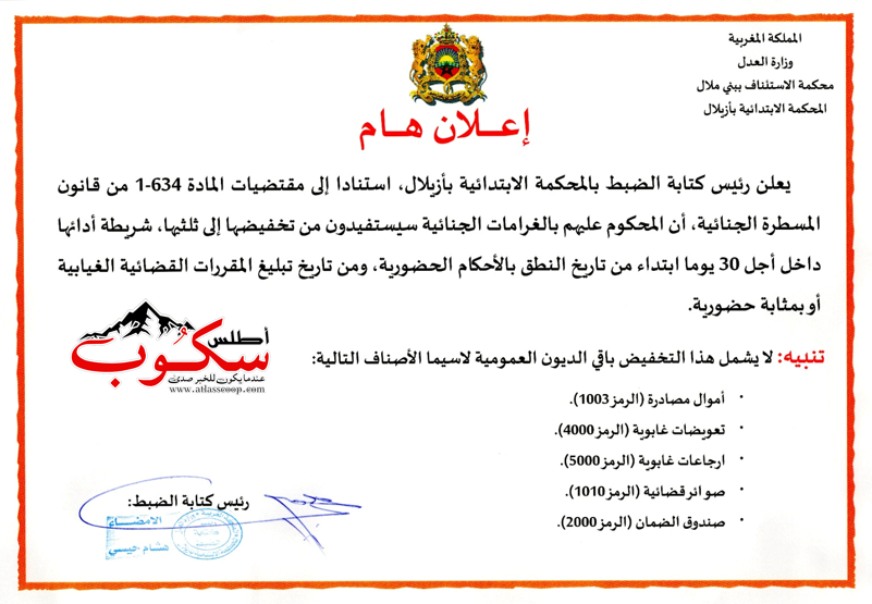 رئيس كتابة الضبط بالمحكمة الابتدائية بأزيلال يعلن تخفيض ثلث الغرامات الجنائية عند الأداء داخل أجل 30 يوماً