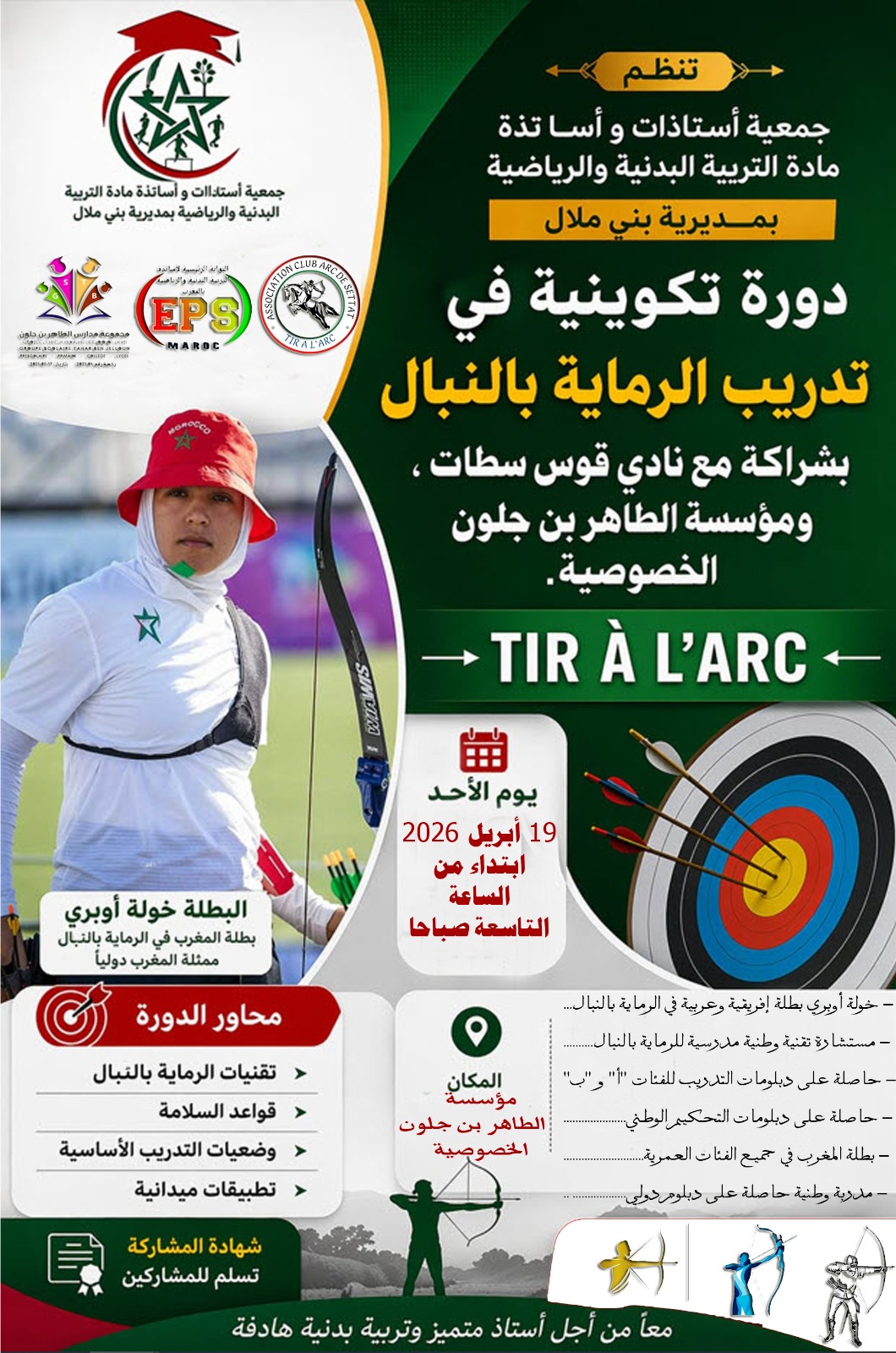 في إطار تعزيز الكفاءات المهنية والارتقاء بمستوى التأطير الرياضي، تنظم جمعية أستاذات وأساتذة مادة التربية البدنية والرياضية بمديرية بني ملال، بشراكة مع مؤسسة الطاهر بن جلون الخصوصية ونادي قوس سطات، دورة تكوينية متخصصة في مجال تدريب الرماية بالنبال.