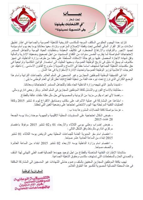 ونددت التنسيقية بالحيف الذي طال الموظفين المجازين، وبالزبونية التي تنهجها في التعامل مع ملفها، وطالبت الحكومة وزارة الداخلية، ادماج الموظفين المجازين في السلم العاشر، انصافا لهم، وفيما يلي نص البيان,