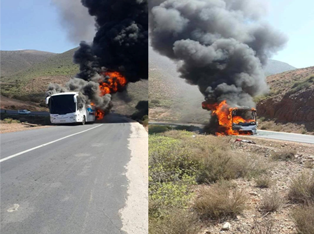 واوضحت المصادر أنه لحسن الحظ، لم يخلف الحادث ضحايا في صفوف المسافرين الذين، شعروا بالرعب بعد اندلاع النيران في الحافلة التي كانت تقلهم.