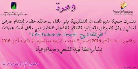 احتضن رواق المركب الثقافي الاشجار العالية ببني ملال اليوم 15 اكتوبر 2016 على الساعة 5 مساء افتتاح معرضا ثنائيا للفنانتين نعيمة اوعياد والشابة نهيلة الشفعي . المعرض نظم من طرف جمعية منبع للفنون التشكيلية و بتعاون مع ادارة هذا المركب الثقافي و يدخل هذا النشاط في اطار المبادرات التي تقوم بها الجمعية من اجل تشجيع الطاقات الابداعية بالمدينة و بالجهة و التعريف بها و باعمالها للمهتمين و الجمهور العريض .