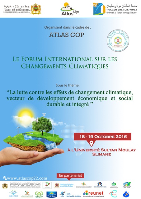 في إطار أنشطتها وتظاهراتها العلمية، وحتى تساهم في التتبع العلمي لقمة المناخ العالمية (COP22) المزمع تنظيمها بمراكش ما بين 7 نونبر و18 نونبر 2016، تنظم جامعة السلطان مولاي سليمان والمجلس الجهوي لبني ملال خنيفرة ، في إطار “أطلس كوب”، ملتقى دوليا حول التغيرات المناخية تحت عنوان “مكافحة الآثار السلبية للتغيرات المناخية، دعامة للتنمية الاقتصادية والاجتماعية المستدامة والمندمجة”، وذلك يومي 18 و 19 أكتوبر 2016 .