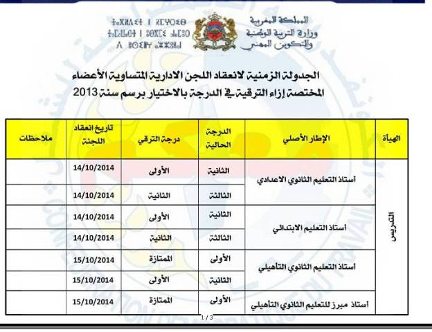 كشفت مصادر نقابية لأطلس سكوب، أن ال 14 من شهر أكتوبر الجاري حدد كموعد لانطلاق عقد اللجان الثناثية المتساوية الأعضاء المختصة إزاء الترقية بالاختيار لموسم 2013، وحدد الجدولة الزمنية حسب ذات المصادر في البرنامج التالي :