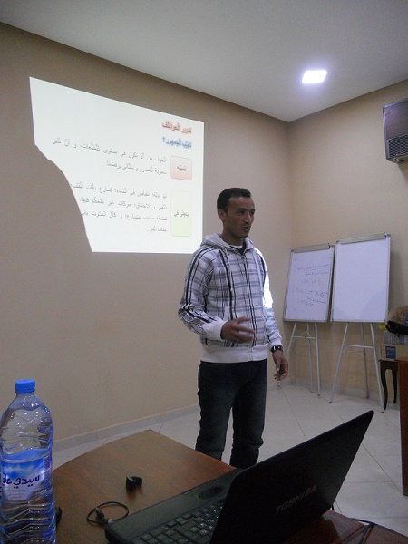 و استهل الأستاذ شفيق الشطيبي عرضه بالتأكيد على ضرورة معرفة الذات و التحكم فيها، مشيرا إلى عنصر تدبير العواطف، و مسببات التهيب من الجمهور، مضيفا أن التهيب يسببه الخوف من أن لا تكون في مستوى التطلعات، و إثارة سخرية الحضور وق تعبير الشطيبي.