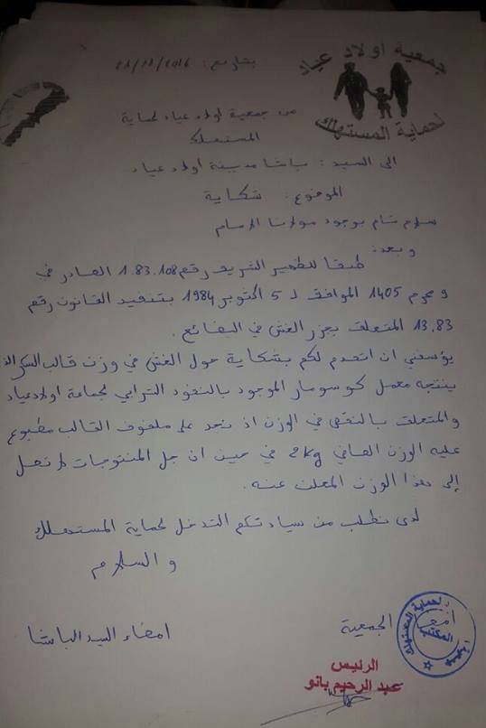 وجهت جمعية حماية المستهلك بأولاد عياد الفقيه بنصالح، شكاية لباشا المدينة، توصل الموقع بنسخة منها، تشتكي من حالة الغش في وزن “قالب السكر” المنتوج في معامل كوزيمار بتراب جماعة اولاد عياد. وطالبت الجمعية من السيد الباشا التدخل والتحقيق في الغش في وزن قالب السكر الذي لايصل الى الوزن المدون في ملفوف “القالب” المنتوج (2كيلو).