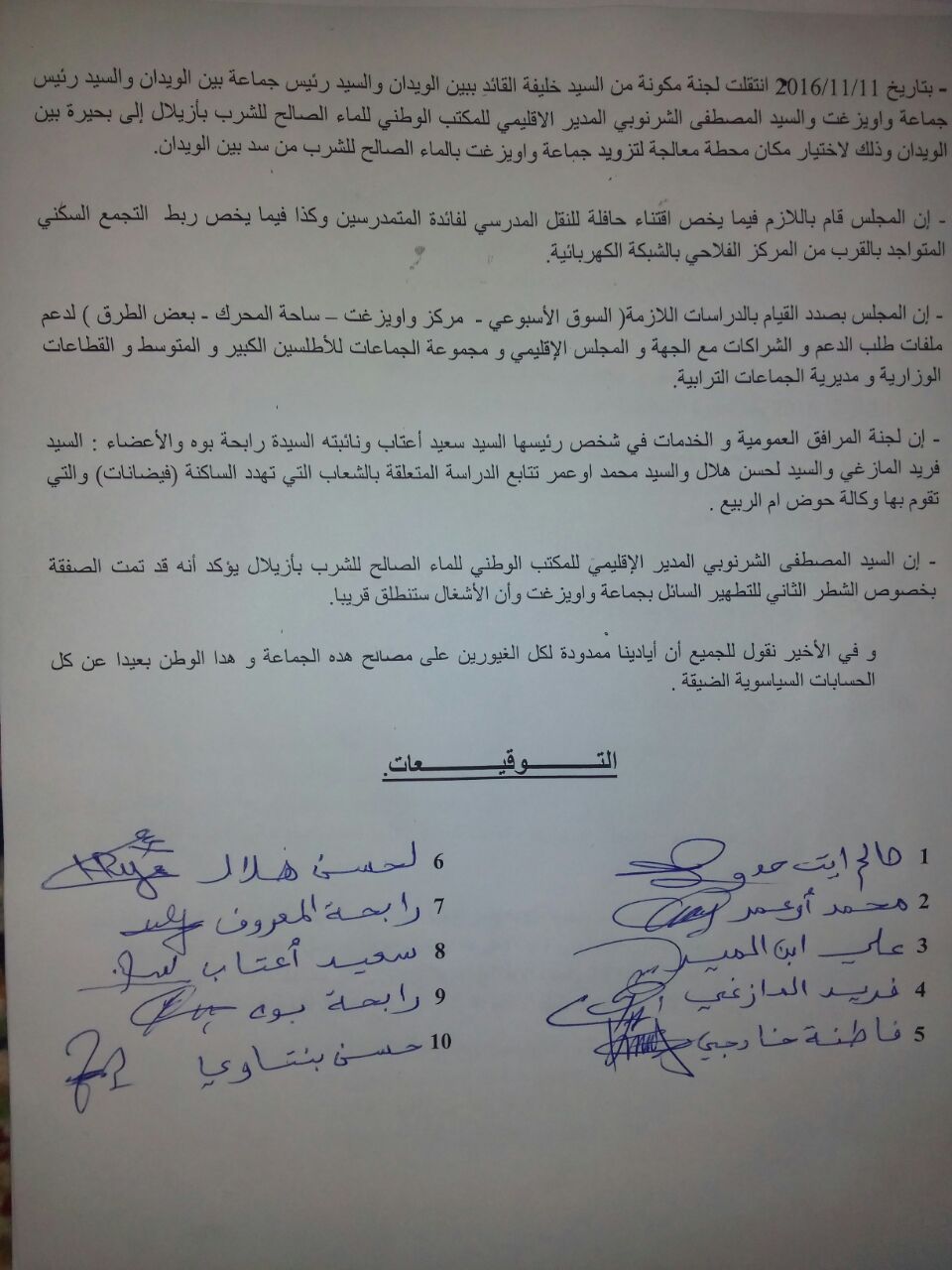 بتاريخ 11/11/2016 انتقلت لجنة مكونة من السيد خليفة القائد ببين الويدان والسيد رئيس جماعة بين الويدان والسيد رئيس جماعة واويزغت والسيد المصطفى الشرنوبي المدير الإقليمي للمكتب الوطني للماء الصالح للشرب بأزيلال إلى بحيرة بين الويدان وذلك لاختيار مكان محطة معالجة المياه لتزويد جماعة واويزغت بالماء الصالح للشرب من سد بين الويدان.