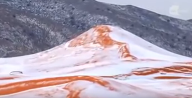 ونشر أحد النشطاء فيديو على موقع “يوتوب” اليوم الاثنين، يظهر كيف غطت الثلوج في مشهد فريد ونادر رمال الصحراء.