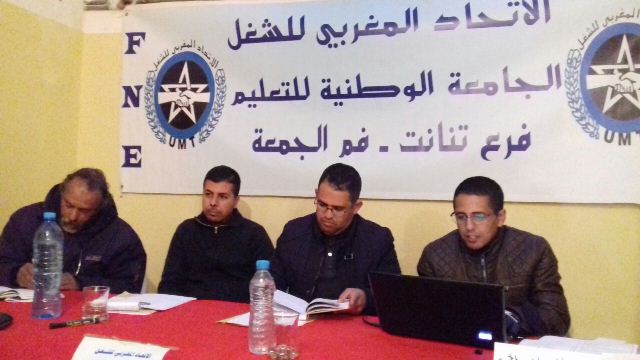 عقدت الجامعة الوطنية للتعليم / فرع تنانت، المنضوية تحت لواء الاتحاد المغربي للشغل (UMT) على الساعة الحادية عشر من صباح يوم الأحد 15 يناير 2017، بمقر الحزب الاشتراكي الموحد بتنانت، جمعا عاما لتجديد المكتب المحلي، حضره الكاتب الاقليمي للجامعة الوطنية للتعليم، وأعضاء المكتب الإقليمي، ومجموعة من نساء ورجال التعليم، وبعد استعراض الوضع التنظيمي للجامعة الوطنية للتعليم محليا ووطنيا، أعقبه مباشرة تلاوة التقريرين الأدبي والمالي، حيث تمت المصادقة عليهما بالإجماع بعد مناقشتها، ليتوج الجمع بانتخاب تشكيلة المكتب الجديد على الشكل التالي: