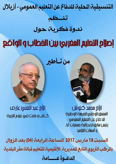 وسيؤطر الندوة الفكرية الباحثين ، احمد كنوش المنسق الوطني للجبهة الوطنية للدفاع عن التعليم العمومي، وعبد الغني عارف الباحث في علوم التربية.