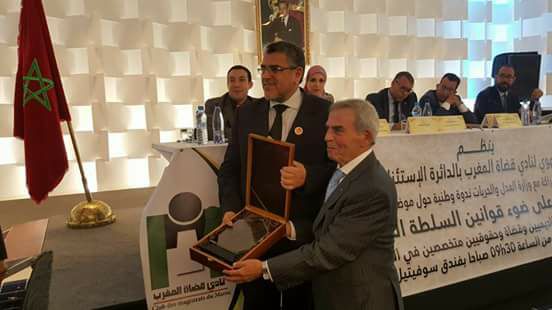 رئيس الغرفة الأولى بمحكمة النقض المستشار عبد العلي العبودي يسلم جائزة المرأة القاضية للأستاذة فادية بنميمون.