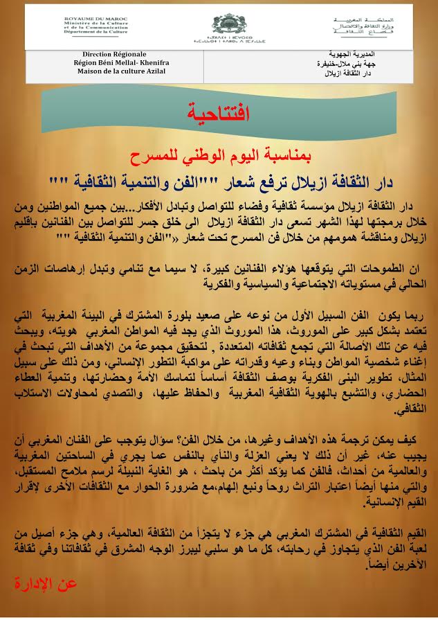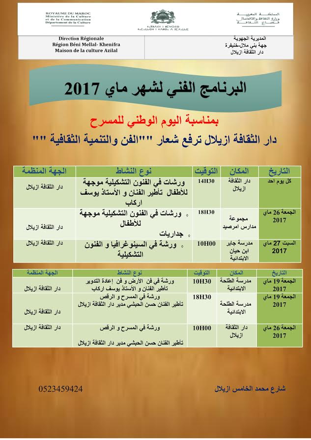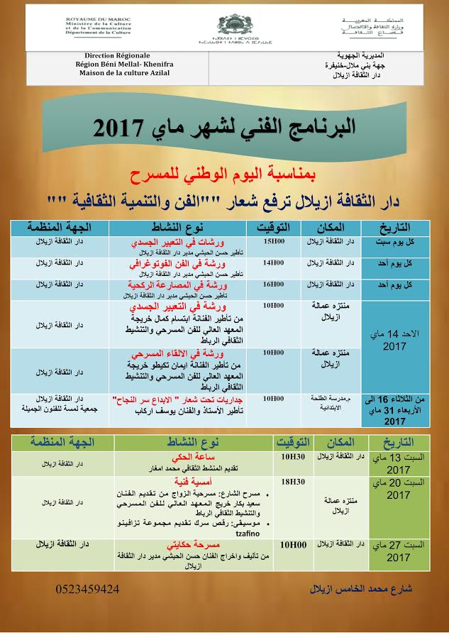 البرنامج الفني لشهر ماي 2017 بدار الثقافة أزيلالتعايش إدارة الموقع نشر في 4 مايو 2017 الساعة 1 و 26 دقيقة مشاركة بفايسبوكFacebookFacebookمشاركة بتويترTwitterTwitter مشاركة بواتسابWhatsAppWhatsApp Share to ارسال ايميلEmailEmail مشاركة بلينكدانLinkedInLinkedInمشاركة بمسنجرMessengerMessenger طباعةPrintطباعة رابط المشاركة :