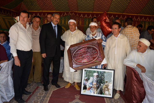وعلى نغمات أحيدوس المحلي – فقرات من التبوريدة المحلية ثم تكريم قيدوم فرسان التبوريدة بالاقليم الفارس خالي حدو أشيبان ( العمر103سنة ).