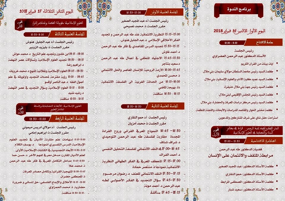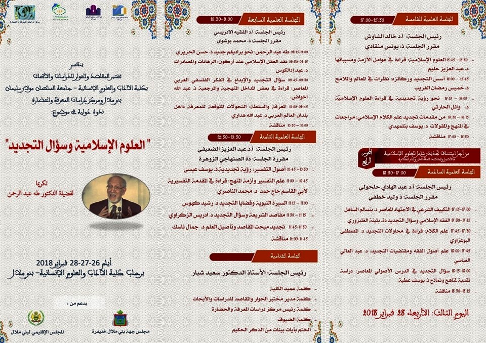 ينظم مختبر المقاصد والحوار والدراسات والأبحاث بكلية الآداب والعلوم الإنسانية ـ جامعة السلطان مولاي سليمان بني ملال ومركز دراسات المعرفة والحضارة ، وبدعم من مجلس جهة بني ملال خنيفرة و المجلس الإقليمي لبني ملال، الملتقى الثالث للباحثين في الماجستير والدكتوراه في تكوين الحوار الديني والحضاري حول موضوع : ” العلوم الإسلامية وسؤال التجديد ” تكريما لفضيلة الدكتور طه عبد الرحمان أيام 26 ، 27 و 28 فبراير 2018.