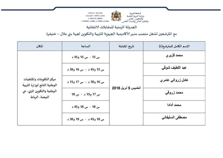 تحصل موقع أطلس سكوب على اللائحة الرسمية للمترشحين للمقابلات الانتقائية لشغل منصب مدير الأكاديمية الجهوية للتربية والتكوين لجهة بني ملال خنيفرة وكذا الجدولة الزمنية للمقابلات الإنتقائية التي ستجرى في هذا الإطار .