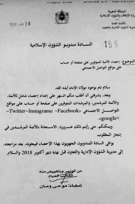 وكانت الوزارة قد أرسلت مذكرة تطلب فيها من المناديب موافاتها بأسماء القيمين الدينيين الذين فتحوا منابر على شبكة التواصل الاجتماعي، كما راسلت المجلس العلمي الأعلى في نفس الموضوع بالنسبة للعلماء.