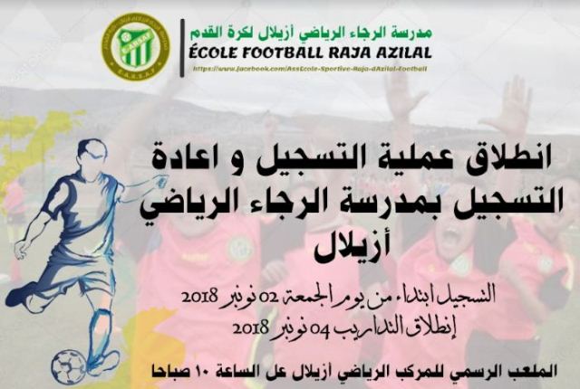 تعلن مدرسة الرجاء الرياضي أزيلال كرة القدم ، أن عملية التسجيل وإعادة التسجيل بالمدرسة لفائدة الأطفال المتراوحة أعمارهم بين 6 سنوات إلى 14 سنة، ستنطلق ابتداء من يوم الجمعة 2 نونبر 2018 ، وستستمر إلى غايةنهاية الأسبوع المقبل، مع الشروع في عملية تقديم الحصص التدريبية للمسجلين انطلاقا من يوم الأحد 4 نونبر 2018 انطلاقا من الساعة العاشرة صباحا .