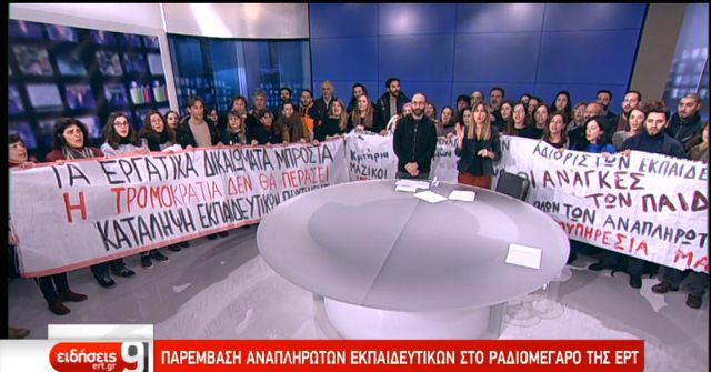 احتجاجا على مشروع قانون أعدته الحكومة اليونانية بشأن تعيين المدرسين، قامت مجموعة من المعلمين باقتحام مبنى التلفزيون اليوناني الرسمي (ERT) أثناء البث المباشر.