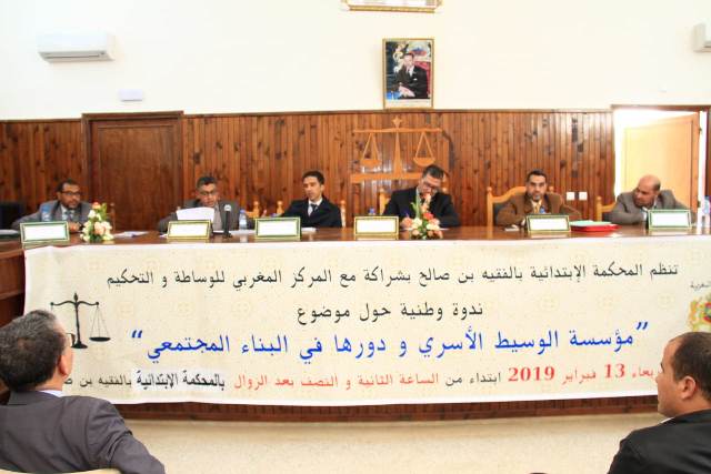 بحضور عامل اقليم الفقيه بن صالح والكاتب العام للعمالة و فعاليات المجتمع المدني زوال أمس الأربعاء 13فبراير الجاري، احتضنت المحكمة الابتدائية بذات المدينة ندوة علمية في موضوع: “مؤسسة الوسيط الأسري ودورها في البناء المجتمعي”، ساهم في تأثيثها المركز المغربي للوساطة و التحكيم بشراكة هيئة المفوضين القضائيين .