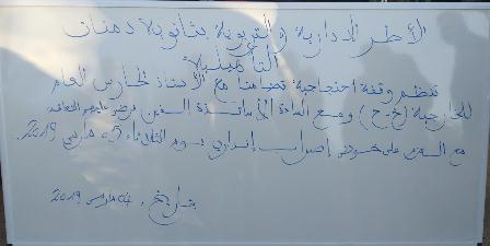 وأعلنت الاطر الادارية والتربوية، عن تضامنها المطلق مع نضالات الشغيلة التعليمية بجميع فئاتها؛ كما أدانت جميع أشكال العنف الذي تتعرض له الشغيلة التعليمية في ربوع المملكة.