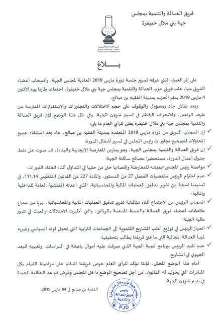 ـ إن انسحاب الفريق من دورة مارس 2019 المنعقدة بمدينة الفقيه بن صالح، جاء بعد استنفاد جميع المحاولات لتصحيح تجاوزات رئيس المجلس في تسيير أشغال الدورة؛