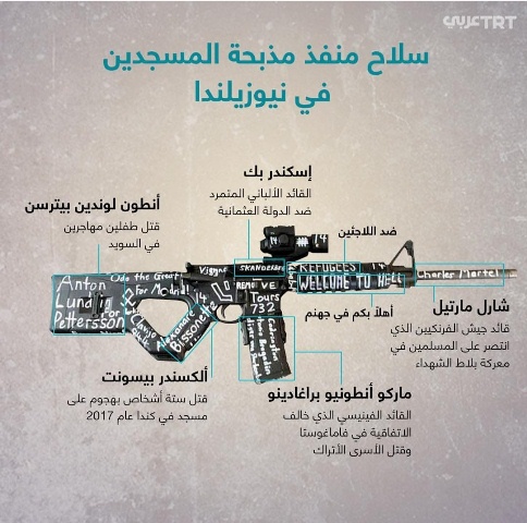 وفتحت الكلمات المكتوبة على الأسلحة المستخدمة في قتل 50 مسلما وإصابة 48 بينهم أطفال في مسجدين في منطقة كرايست تشيرش، نقاشا واسعا بين النشطاء.