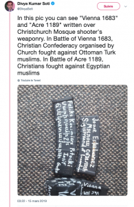 وكتب أحد المعلقين ويدعى “ديفيا كومار” أن مطلق النار كتب إشارات إلى الحروب الصليبية على أسلحته، كما كتب اسم تشارلز مارتيل القائد العسكري الذي صد دخول المسلمين إلى فرنسا في 732 ميلادية.