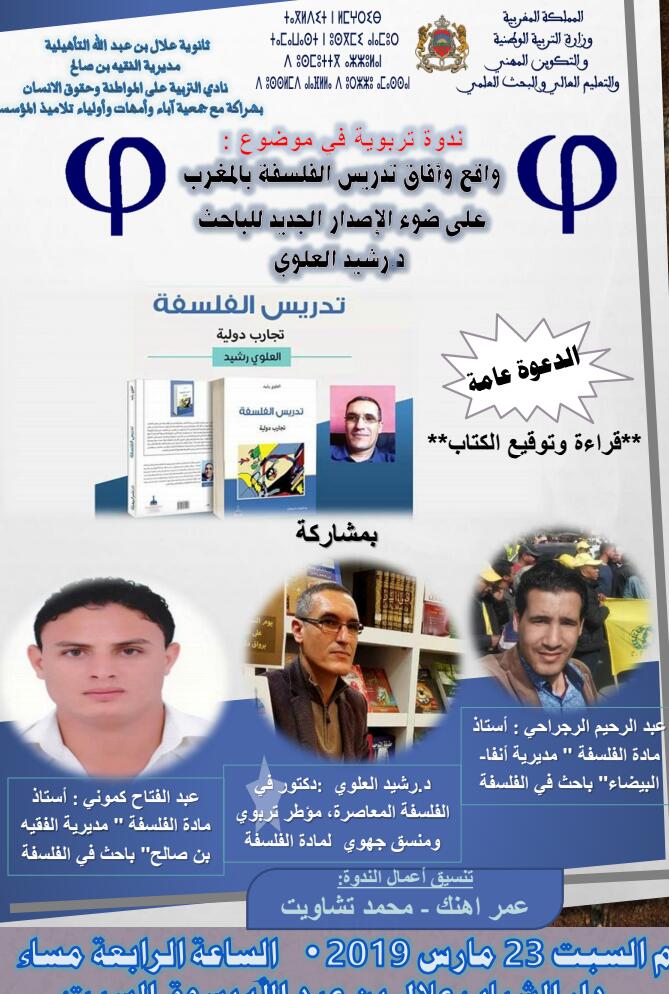 ينظم نادي التربية على المواطنة وحقوق الإنسان بثانوية علال بن عبد الله التأهيلية، بشراكة مع جمعية آباء و أمهات وأولياء التلاميذ بالمؤسسة، ندوة تربوية حول واقع وافاق تدريس الفلسفة بالمغرب على ضوء الاصدار الجديد للدكتور رشيد العلوي المراقب التربوي بجهة الدار البيضاء، من تنظيم نادي التربية على المواطنة وحقوق الإنسان بثانوية علال بن عبد الله مديرية الفقيه بن صالح.بدار الشباب سوق السبت بدار الشباب علال بن عبد الله _ سوق السبت- يوم السبت 23 مارس 2019، ابتداء من الساعة الرابعة مساء.