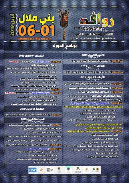ستحتضن مدينة بني ملال خلال الفترة الممتدة من 01 إلى 06 أبريل الدورة الأولى للملتقى الدولي روافد للفنانين التشكيليين الشباب بشعار : ” إبداعات الشباب بألوان التسامح” والمزمع تنظيمه من طرف جمعية منبع للفنون التشكيلية ببني ملال بشراكة مع وزارة الشباب والرياضة وذلك من خلال برنامج غني بعدة فقرات فنية و فكرية متنوعة سوف تكون على الشكل التالي :