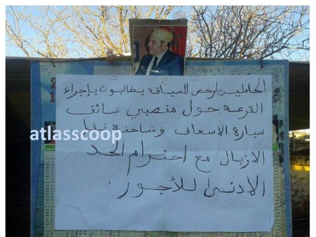 وطالب المحتجون في عريضة توصلت بها جريدة أطلس سكوب، باحترام الحد الادنى للاجور، بالنسبة للسائقين المحتمل اختيارهم عن طريق القرعة.