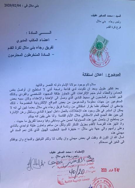 بني ملال 4 فبراير 2020/ومع/قدم رئيس المكتب المديري لنادي رجاء بني ملال محمد عفيف، اليوم الثلاثاء رسميا استقالته من رئاسة النادي بعد سلسلة من النتائج السلبية.