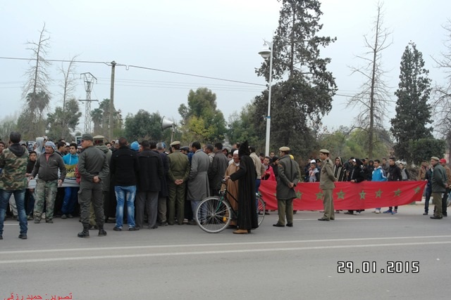 و اختار المحتجون و أغلبيتهم شباب تنظيم مسيرة مشيا على الأقدام رافعين صور جلالة الملك و أعلام وطنية و قطعوا مسافة 15 كلم حتى مدخل المدينة حيث وجدوا في استقبالهم مدير ديوان العامل و رئيس قسم الشؤون الداخلية و قائد و رجال الدرك الملكي و القوات المساعدة و الأمن .