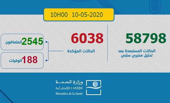 الرباط/ 10 ماي 2020 (ومع) أعلنت وزارة الصحة عن تسجيل 128 حالة إصابة مؤكدة جديدة بفيروس كورونا المستجد حتى العاشرة من صباح اليوم الأحد ، ليرتفع العدد الإجمالي لحالات الإصابة المؤكدة بالفيروس بالمملكة إلى 6038 حالة.