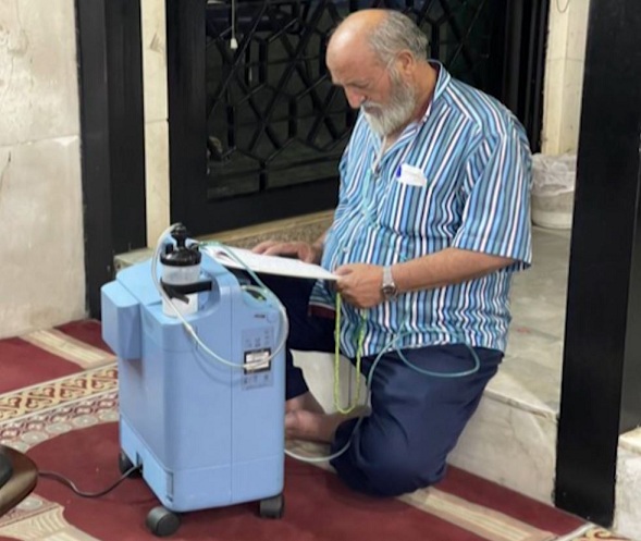 ونشر إمام وخطيب جامع الإمام علي بن أبي طالب في بيروت الشيخ حسن مرعب صورة على حسابه على تويتر يظهر فيها رجل غزا الشيب ذقنه، وهو يجلس على عتبة داخل المسجد يقرأ في القرآن، بينما أنبوب التنفس مثبت على أنفه وموصول بآلة أكسجين أمامه.