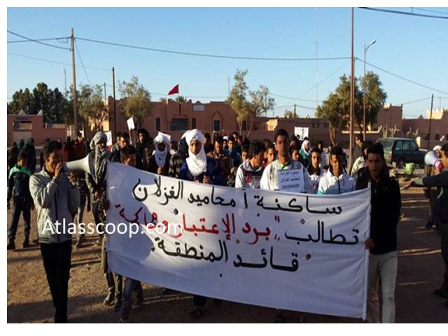 نظم مئات المواطنين من أبناء قبيلة “اعريب” الصحراوية بامحاميد الغزلان مساء السبت 07 مارس 2015 ،مسيرة حاشدة جابت مختلف شوارع المنطقة،احتجاجا على ما أسموه “التصرفات المشينة و العنصرية” لقائد امحاميد الغزلان بعد تسريب “وثيقة سرية ” (حصلنا على نسخة منها) لم نتأكد من صحتها و مسربها ،تضمنت تهما بالانفصال والترامي على الأراضي في حق قبيلة “اعريب” الصحراوية بامحاميد الغزلان.