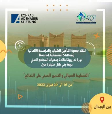 من المنتظر أن تنظم جمعية التأهيل للشباب والمؤسسة الألمانية Konrad-Adenauer-Stiftung، دورة تدريبية لفائدة جمعيات المجتمع المدني بجهة بني ملال خنيفرة، وذلك في الفترة الممتدة بين 16 و20 فبراير 2022 بمنطقة بين الويدان، قصد التعرف على مسار بناء مخططات التنمية الجهوية وبرامج العمل لتعزيز قدرات الفاعلين الجمعويين على فهم آليات العمل التشاركي والحوار المؤسساتي المبني على الاستدامة وكيفية تقديم أراء استشارية بطريقة فعالة وناجعة، مما سيمكنها من تعزيز مسار الترافع الترابي من أجل إدماج قضايا الفئات الهشة في صلب صناعة القرار العمومي.