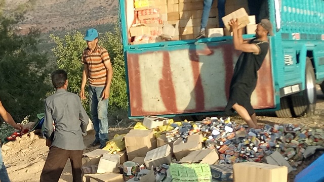 في خطوة محمودة وعلى غير ما بثنا نسمعه عند وقوع حوادث السير من تسابق الناس إلى نشل وسرقة أغراض المصابين أو نهب السلعة الموجودة بالشاحنة التي تعرضت لحادثة السير، لم نشهد مثل هذه المشاهد في حادث السير الذي وقع زوال اليوم بأحد منعرجات بين الويدان إثر انقلاب شاحنة محملة بأطنان من السمك المعلب بمختلف الأنواع والأشكال.