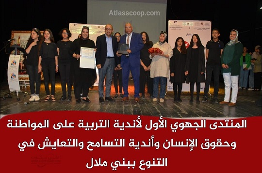 نظمت اللجنة الجهوية لحقوق الإنسان والأكاديمية الجهوية للتربية والتكوين بجهة بني ملال-خنيفرة، يومه الخميس 2 يونيو 2022، بدار الثقافة ببني ملال، المنتدى الجهوي الأول لأندية التربية على المواطنة وحقوق الإنسان وأندية التسامح والتعايش في التنوع.